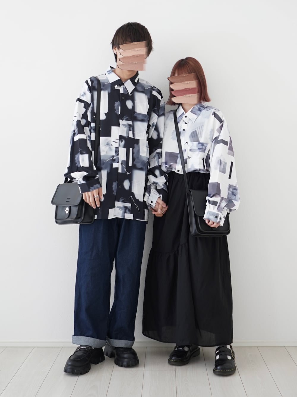 【柄シャツコーデ】 Naive magicの新作シャツを使ったコーデ! サラッとした生地感で着心地◎ ナチュラルストレッチポリエステル バルーンスリーブ サイドスリット 長袖総柄シャツ ブラック系その他 / Lサイズ着用 ☑️Instagram▶︎kose_wear