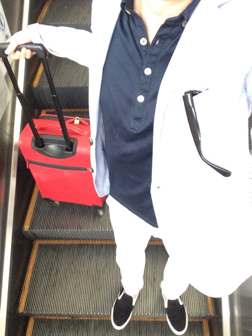 【連続41日更新中】 白ジャケットに見えるけど、白x紺のストライプです。 遠出に見えるけど、自宅の最寄駅から電車で30分の移動です。