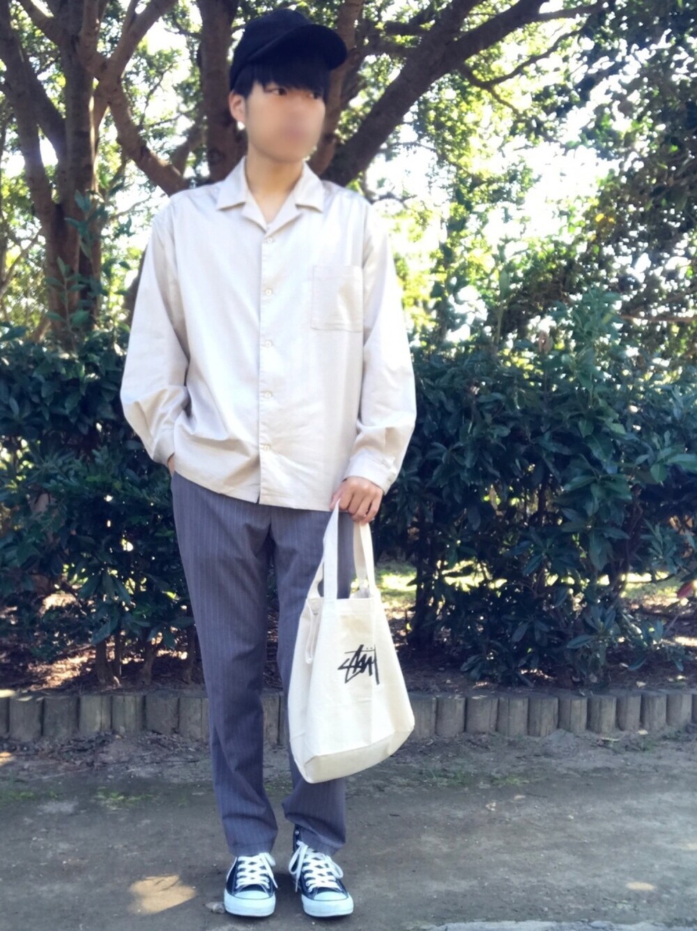 昨日は休日でした!^_^ 何故でしょうか。休日になると食欲が凄い事に…。 平日は我慢している食べ物が食べたすぎて、アイスクリームとポテチと大福2個とナッツバーと白米大盛りをやけ食いしてしまいました(笑) あぁー。食べちゃった(涙)。今日と明日で頑張って食べすぎた分を消費します…(涙) 昨日の休日の服装です。 全体的にユルってしている服を着ました。 キャップとスラックスはGU。 シャツはSENSE OF PLACE。 トートバッグは雑誌のsmartの付録のもの。 スニーカーはconverse。