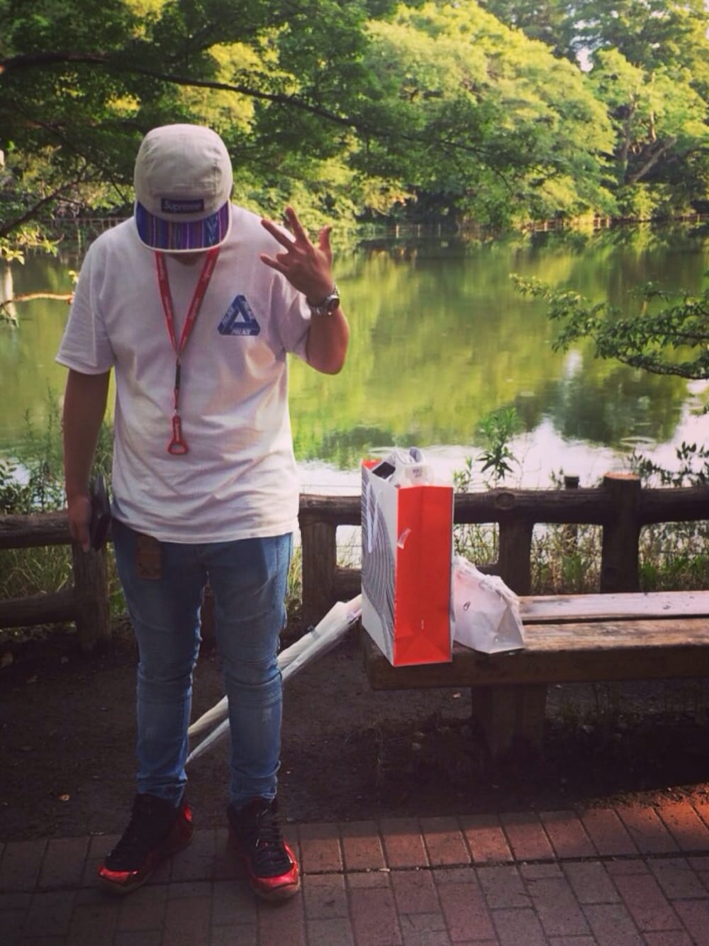 パレスTに赤のパレスロゴバックプリントがあって後ろからの見た目も抜群です! パンツはリプレゼントのバイカーデニム(^o^)/ ちなみにこの日本当はairmax90のコルクを履いていこうと思いましたが生憎の雨で急遽ポジットになりました笑