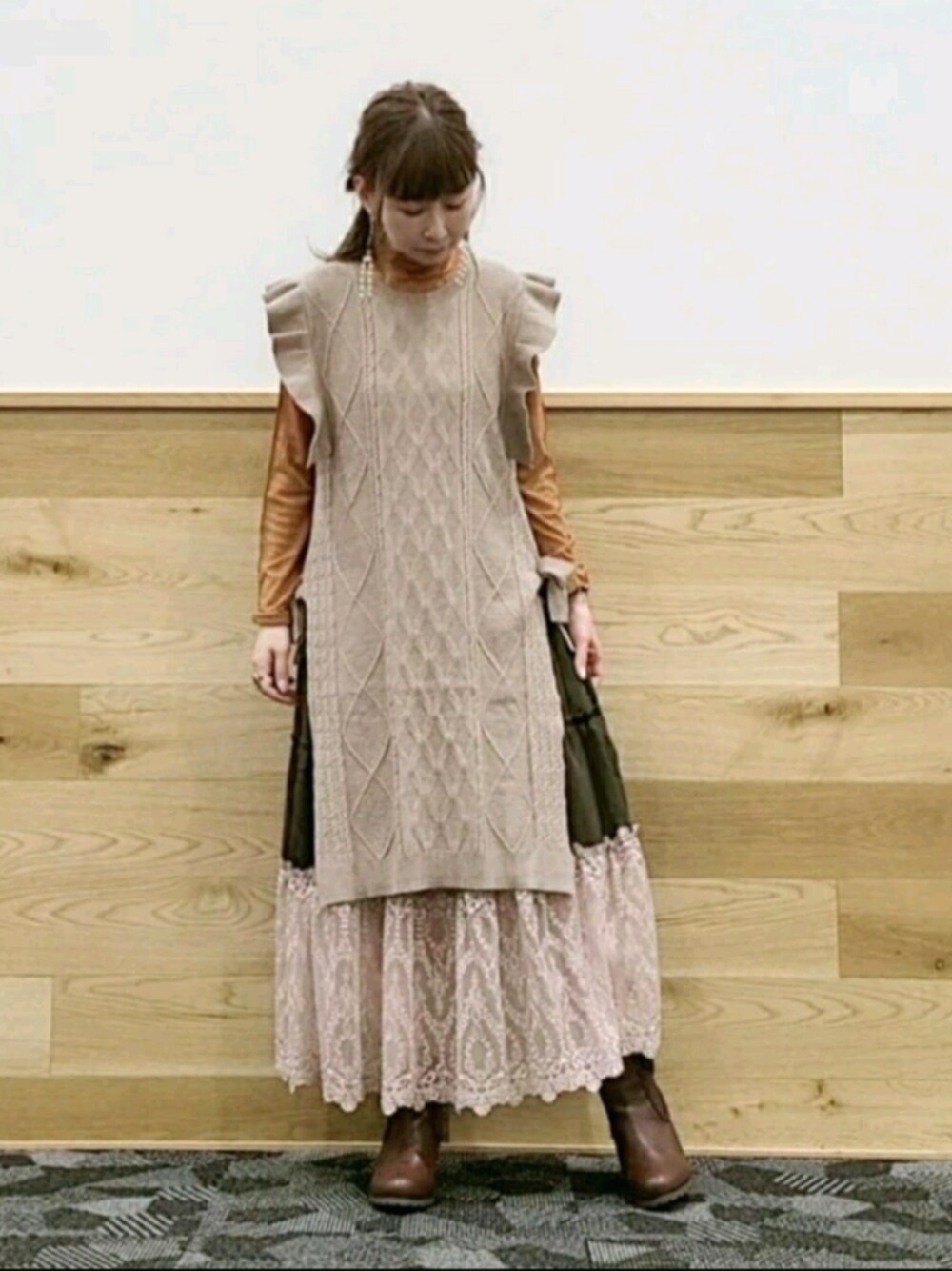 ニットベストを主役に裾レースのスカートを合わせて💫 シアートップスのオレンジを差し色に🍊 Instagram >> @__kosumeru058__