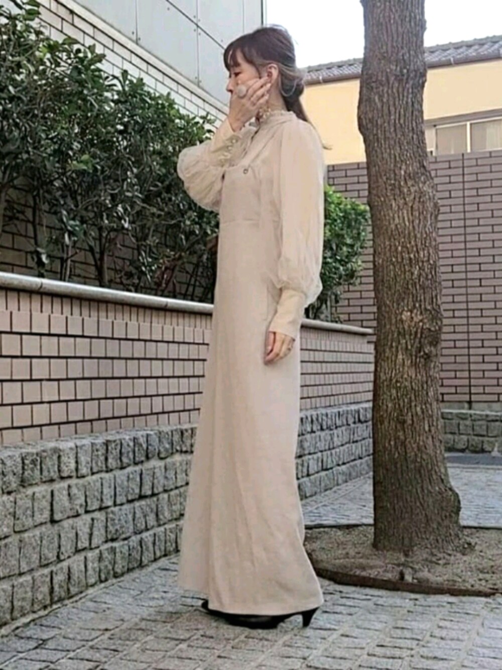 ベージュのワントーンコーデ🍂 袖チュールのブラウスは手を長く見せてくれて、サロペットは脚長に見せてくれる優秀アイテムです👌 Instagram >> @__kosumeru058__