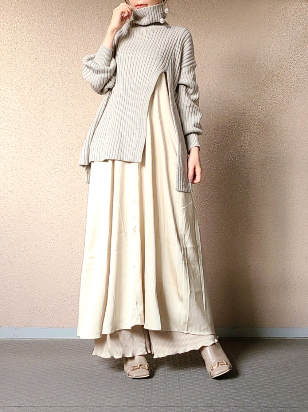 深いスリットがポイントのニットにキャミワンピースを合わせました🐏 プリーツパンツを重ねてレイヤードスタイルに👖 Instagram >> @__kosumeru058__