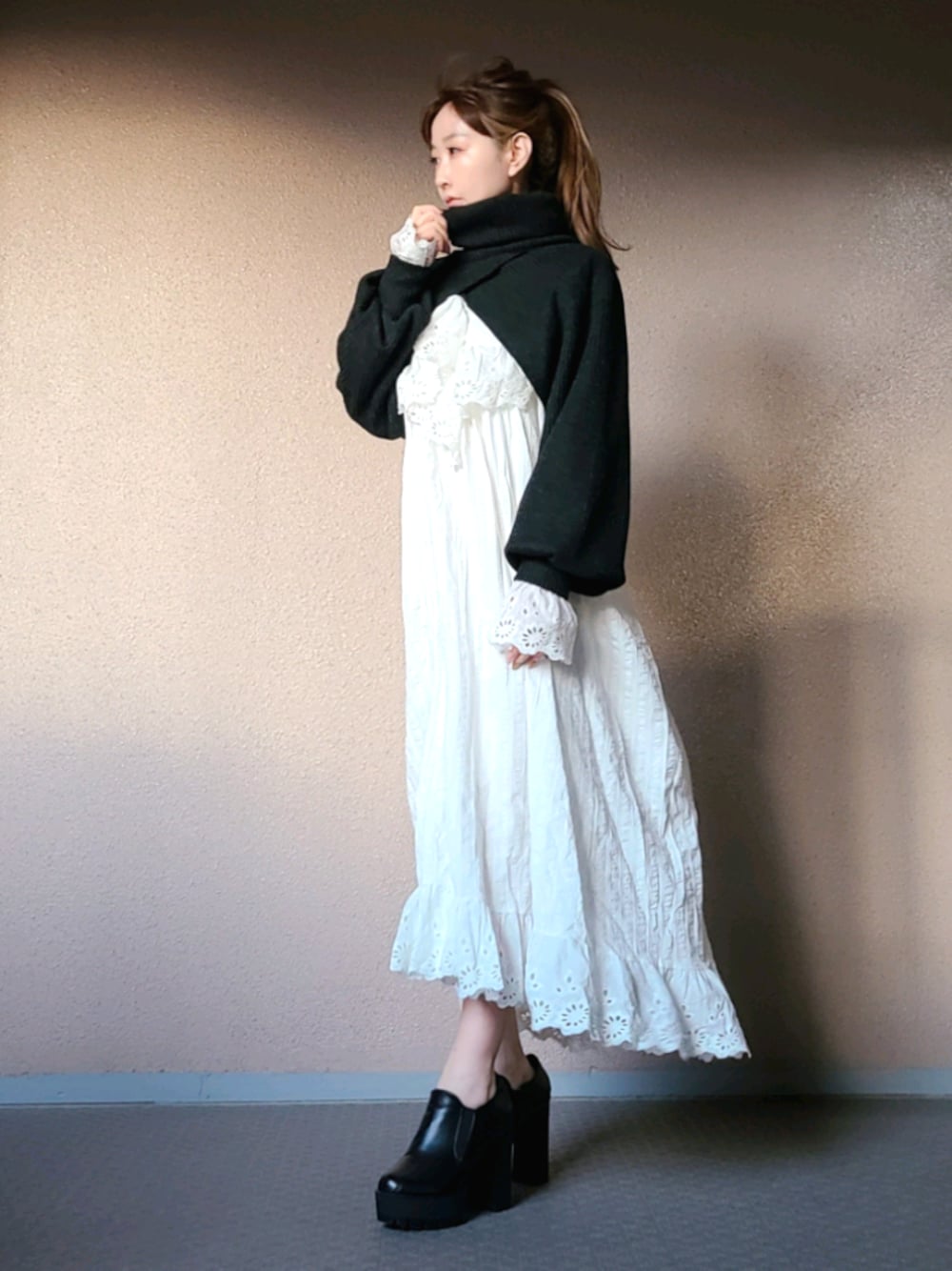 ガーリーなワンピースにショート丈のタートルニットを合わせて🖤 Instagram >> @__kosumeru058__