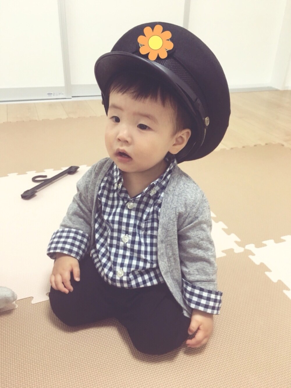 パパの仕事着の帽子 かぶらさせてキョトン 赤ちゃん筆をつくるため散髪屋さんで髪を切ってきました 人生初のカット! 伸びるのが遅い&毛量が少ない息子 長い道のりだった… うざったい前髪が切れて ようやくサッパリ