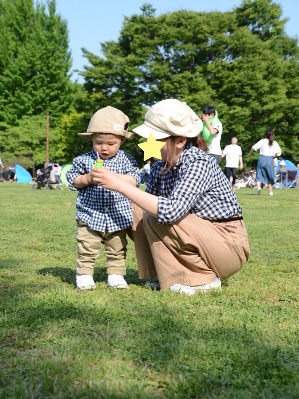 お弁当持って ピクニック♪ ひさしぶりにリンクコーデ ベージュ帽子 × ギンガムシャツ × チノパン × コンバース 母からシャボン玉を奪い取ろうとしております