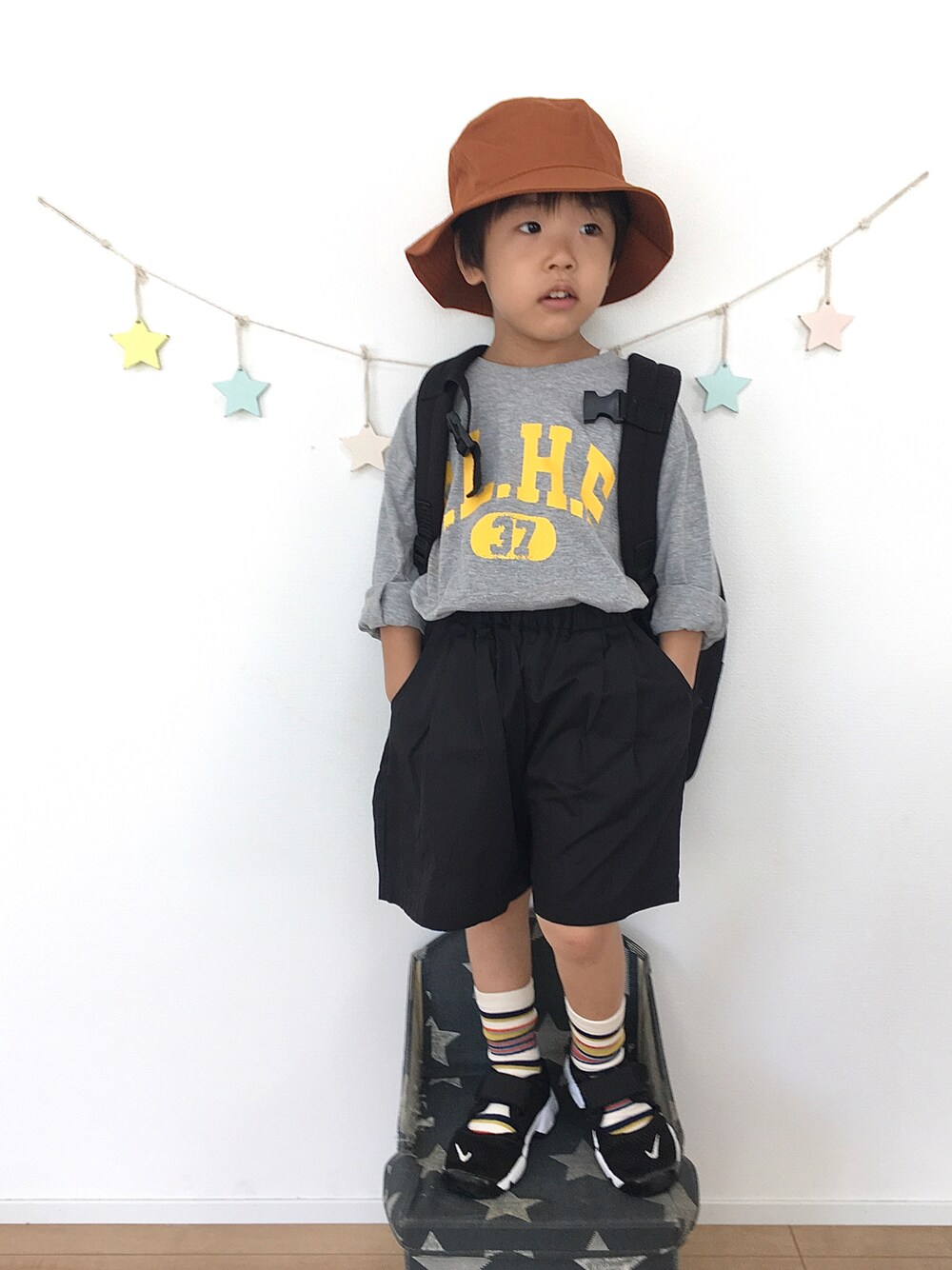 ピックアップタグ #プリントT マーキーズさんのプチプラT〜♪ 珍しくグレーチョイス イエローロゴかわい♡ でもグレー着慣れなくて合わせかた迷子 結果、ザ・無難なブラックに(笑) けどやっぱ色入れたくて オレンジブラウンのバケハ さりげなくロゴ色とバケハの色を拾った カラフル靴下がポイントかな💛🧡 昨日から2学期 ようやく公園地獄から解放された…笑 久しぶりに昼間1人なので 溜まりまくった録画ビデオ観なきゃ!