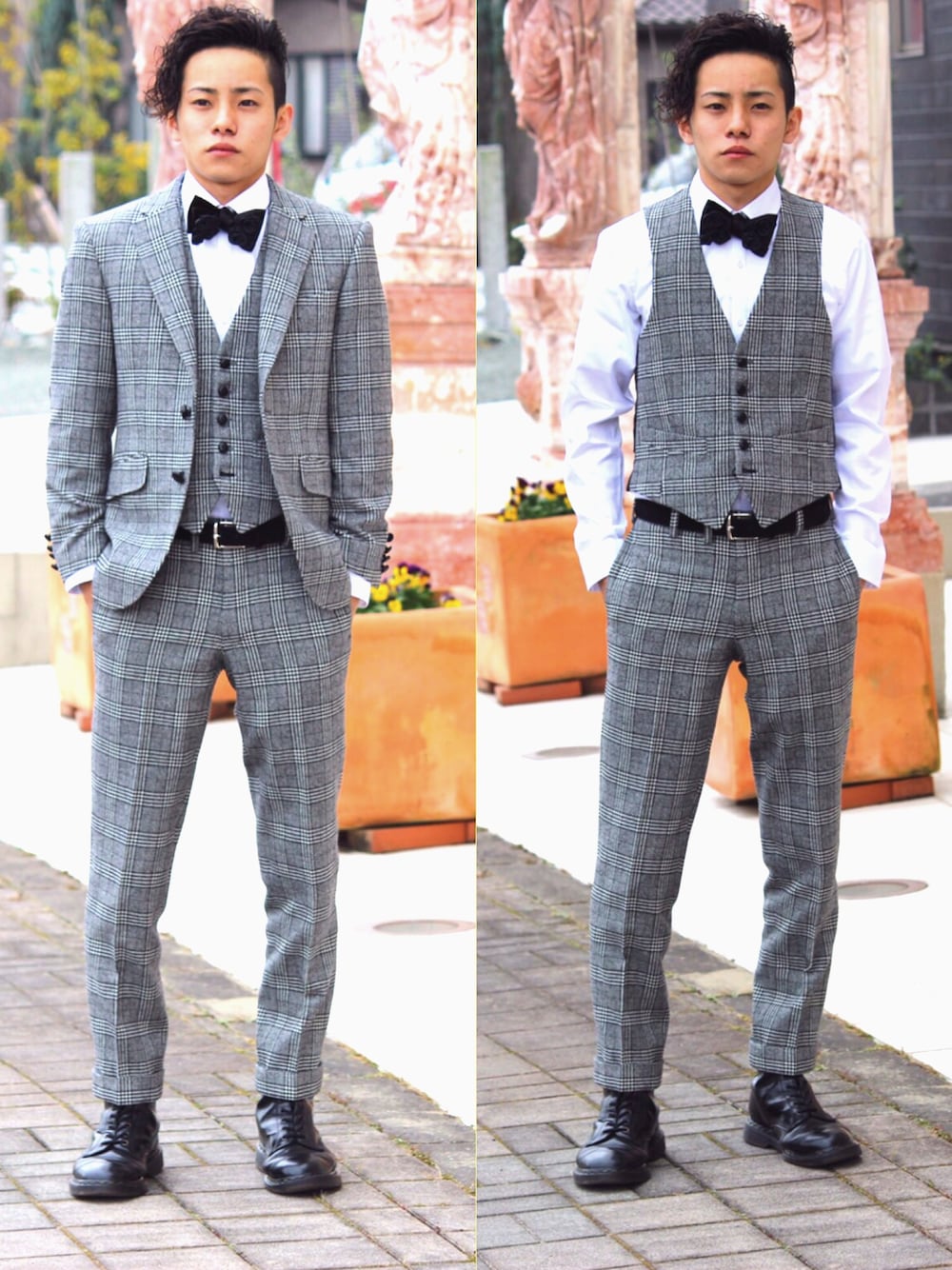 もうすぐ成人式から1年…。 スーツはツイード生地でオーダーしました😊 写真には写ってはいませんがエルボーパッチを付けたのが自分的にポイントです😚💕 ネクタイはgiraffeのローズの蝶ネクタイです!バラの花になってて一目惚れしました🌹 ブーツはDr. Martensの刻印前のブーツです🤓