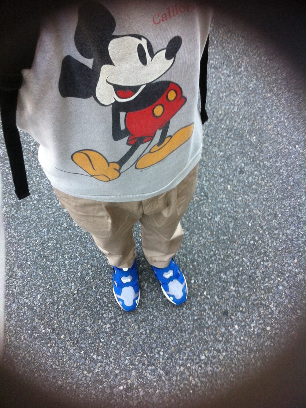 今日は春っぽく 古着のミッキーのスウェットに ベージュのパンツ 靴はポンプ リュックはギャルソン ミッキーを集めているが なかなかサイズがないんです。