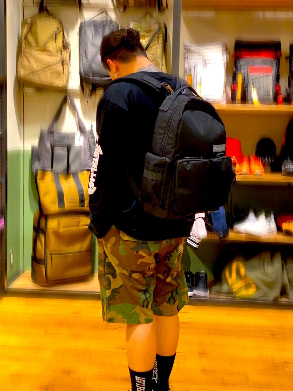 2020.5.24 AVIREXららぽーとEXPOCITY店STYLE スタッフ身長: 165cm 着用サイズ: ハーフパンツ XL(CAMO) バックパック FREE