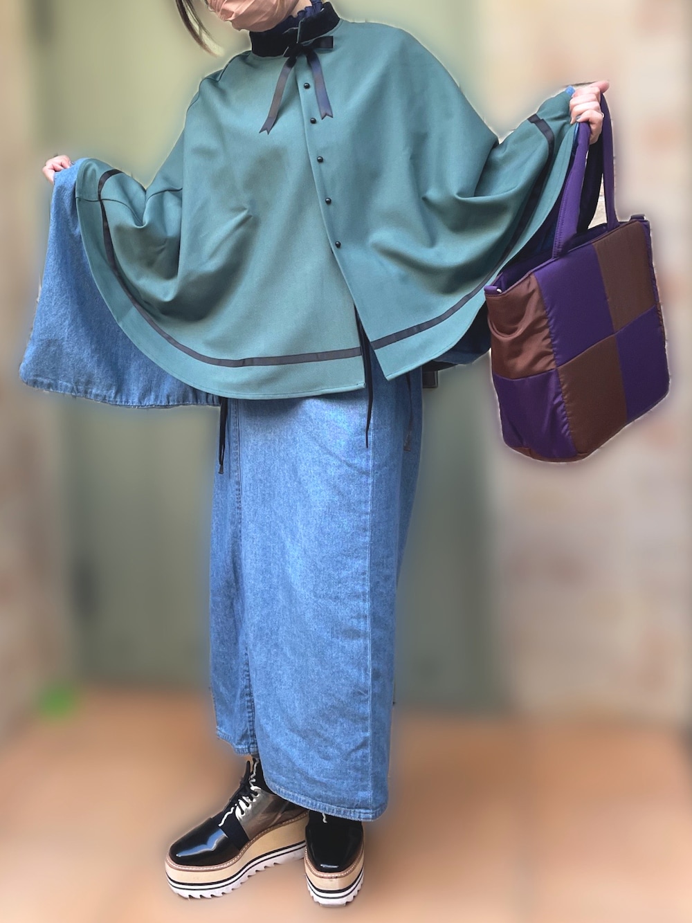 ちゃー のトートバッグ「ブロッキングパッファーバッグ」を使ったコーディネート