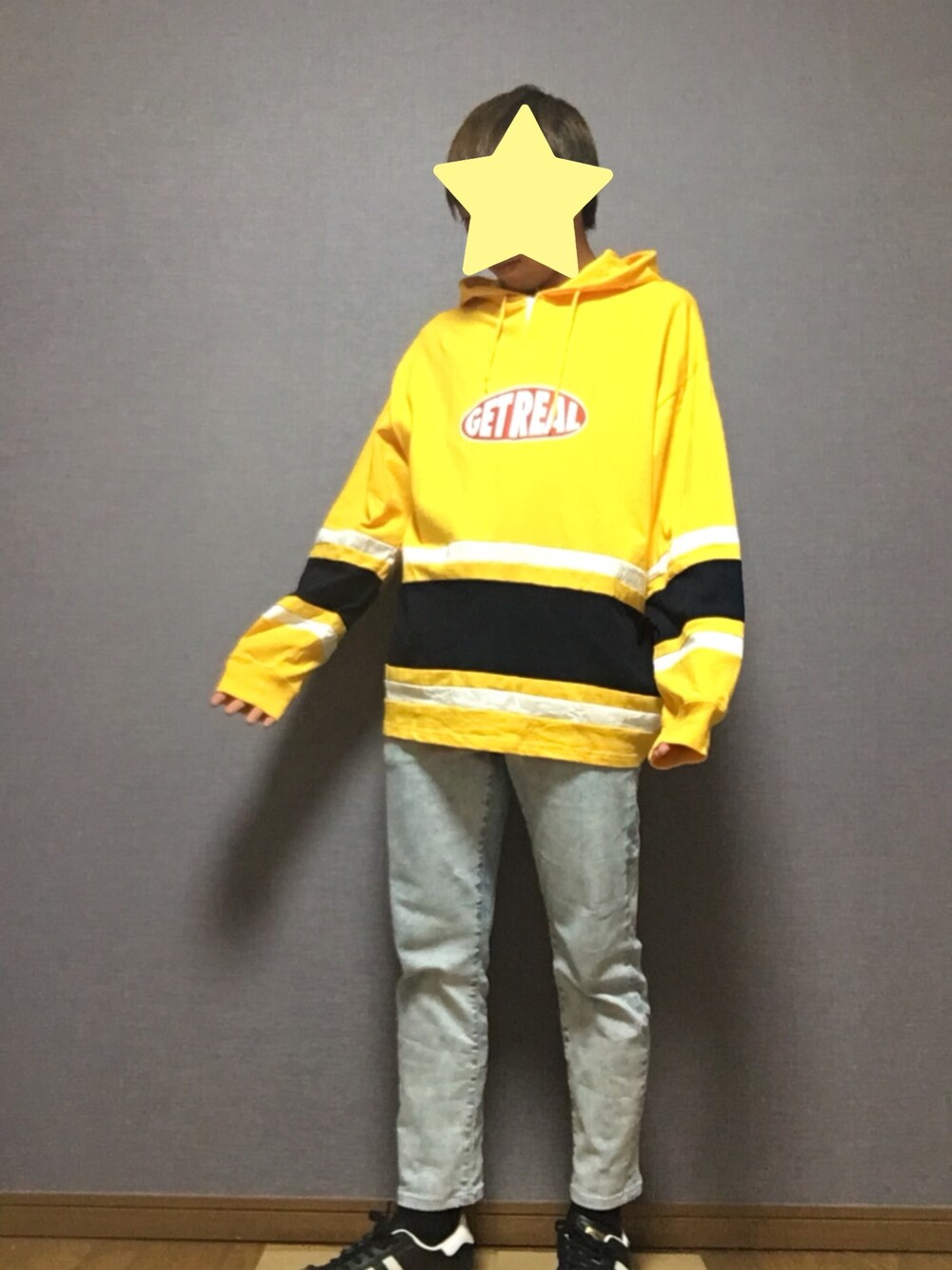 オーバーサイズでトレンド感を出しました 普段着ない黄色いパーカーも、白黒ラインが入ってるので、足元でそれを拾うことでコーデをまとめました。 黒スキニーではなくデニムにすることで、よりストリートに寄せるようにしました。 靴下や、合わせるパンツ、スニーカーで改善点などあれば遠慮なくコメントなどください🙇♂️