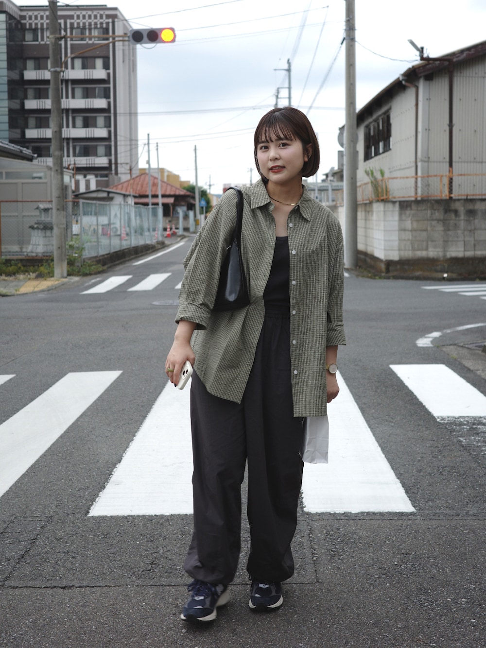 深めのグリーンシャツとチャコールグレーのアイテムで秋色コーディネート。 シンプルカジュアルが最近の好みです!