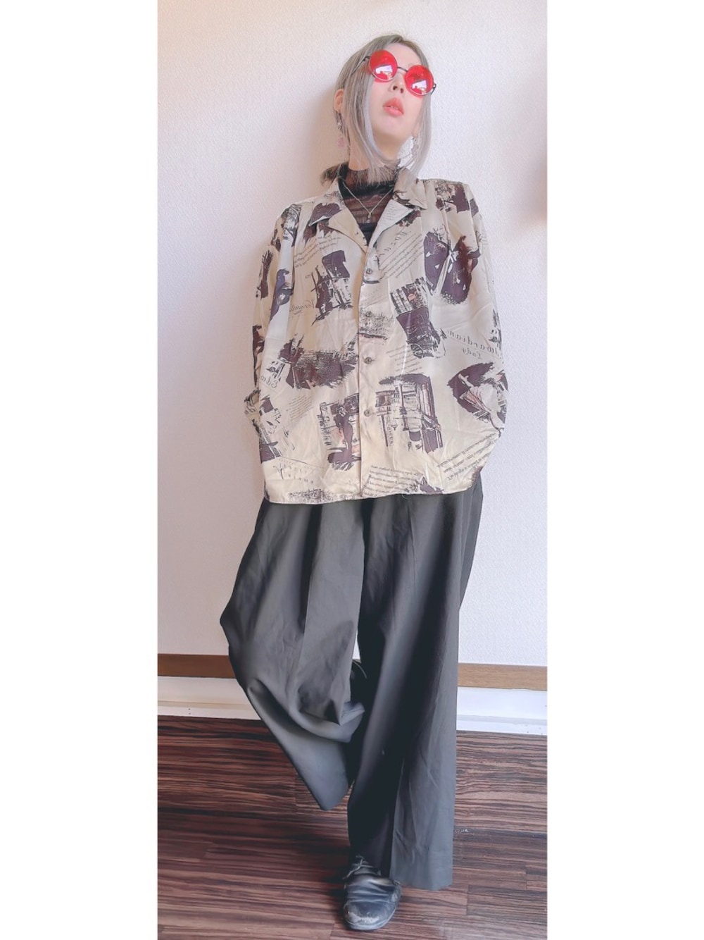 #今日のコーデ 治安悪い系最近ちょっとハマってる。 古着屋とかリサショ巡るの好きでこちらは シャツとパンツ合わせて¥500笑 元の値段はわからんけどタグ見るとフランス製だったりするから結構お高かったんじゃないかなぁ。。 グラサンは確か390マート。笑
