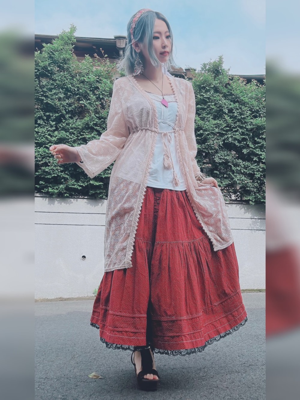 カーディガンとスカートは古着屋でそれぞれ500円。 このコーデで1番高いのはヘアアクセ2万弱、ネックレス1万弱です。(どっちも大好きな作家さんのやつ) 古着やプチプラでもワンポイントに高めのこだわりアイテムを入れておけばそれなりに見えるよね的なやつ。 ピアスはどっかの博物館でお迎えした、インドとかの輸入のやつです。