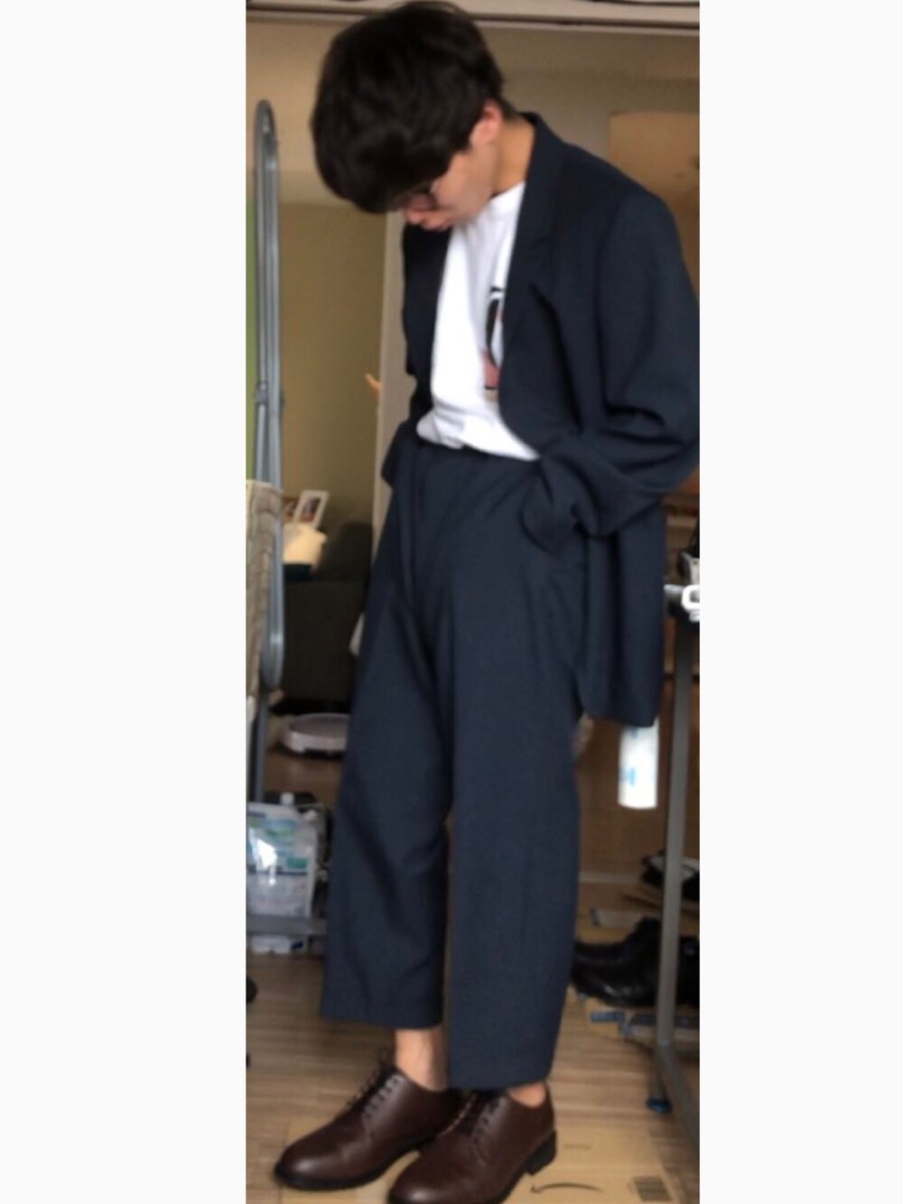 セットアップコーデです! ポイント ・インナーにプリントTシャツ ・靴をあえて茶色にして足長効果 ・オーバーサイズのジャケット ・タックイン ・アンクルパンツでスッキリと これらのポイントで、オシャレになるよう計算してますー 服のより詳しい考え方はブログに書いてあります。プロフからぜひ