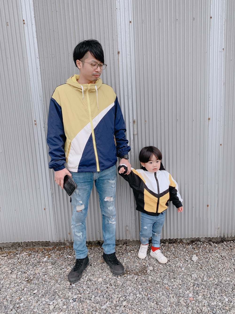 ☻ パパリンク〜 ✧✧ ナイロンジャケット?? ナイロンパーカー??でリンク✿· イエロー系のカラーで 合わせてみました(*˙˘˙*) それにダメージデニム🙆 こっちゃんだけで撮ったのは ぶれっぶれでした📸(笑) こっちゃんにも オールブラックのハイカットの VANSをメルカリで買ったけど こっちゃんの甲が高すぎて 入らなかった🤣🤣 諦めました🤣(笑)