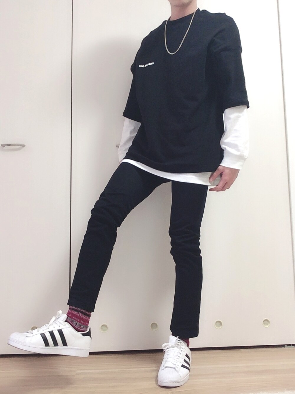 こんにちは!! 今日もGUを多く取り入れたコーデになっています!! このGUのルーズフィットTのサイズ感と後ろのバックプリントが最高👍 レイヤードも入れてモノトーン+ストリートを取り入れました😄 靴下の色を赤にして差し色に🔥