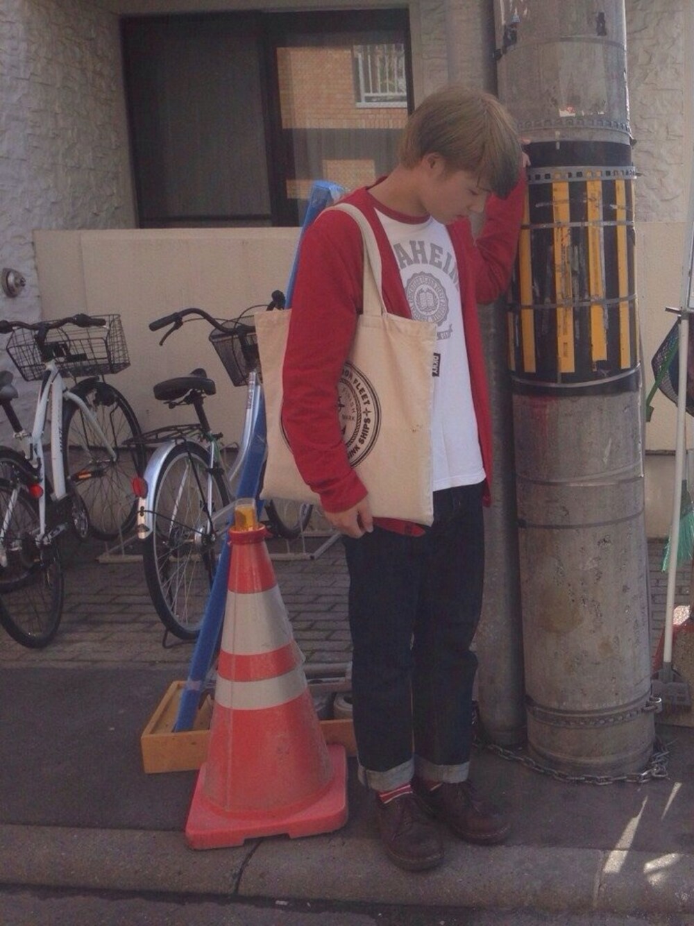 Tシャツ・カットソー:champion カーディガン:used デニムパンツ:UNIQLO シューズ:Dr.Martin 赤で攻めてみました🙌 シンプルなかんじがキテますね