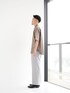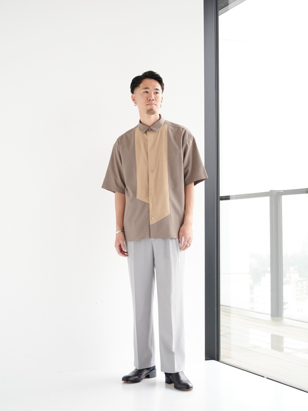 切り替えのデザインが特徴のシャツに、キレイめのスラックスを合わせたスタイルです。 1枚で主役になれるシャツがシンプルになりがちな夏のコーディネートのアクセントになってくれます。