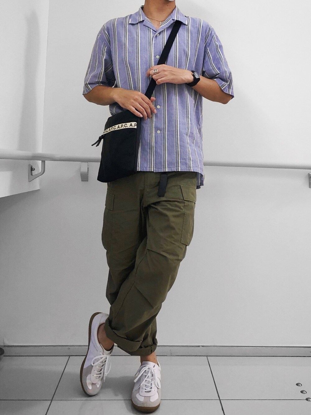 ✣✣✣✣✣✣✣✣✣✣✣✣✣✣✣✣✣✣✣✣✣✣✣✣✣✣✣✣✣ -𝟛 ℙ𝕆𝕀ℕ𝕋𝕊 𝕠𝕗 𝕋𝕆𝔻𝔸𝕐𝕤 𝕆𝕌𝕋𝔽𝕀𝕋 - ❶オーバーサイズの開襟シャツに太めの カーゴパンツでリラックススタイル! ❷ロールアップでダボダボ感を回避。 ❸黒アイテムでコーデを引き締め✌︎ ✣✣✣✣✣✣✣✣✣✣✣✣✣✣✣✣✣✣✣✣✣✣✣✣✣✣✣✣✣ フォロー、いいね!いつもありがとうございます^ ^ べー。です。 ・ADAM ET ROPE'のストライプ開襟シャツ ・HRMのカーゴパンツ ・greenlabel relaxing別注GERMAN TRAINER ・A.P.C.のSACOCHE REPEAT 20P 今日は暑かったですね。。 休日だし、凄く暑かったので、 明るい色味を使い、ゆるっとしたシルエットで コーデを組んでみました! コーデはシルエットなども重要ですが、 TPOに合わせて、動きやすさ・楽さを 重視したりするのも大切ですよね。 ではまた^ ^