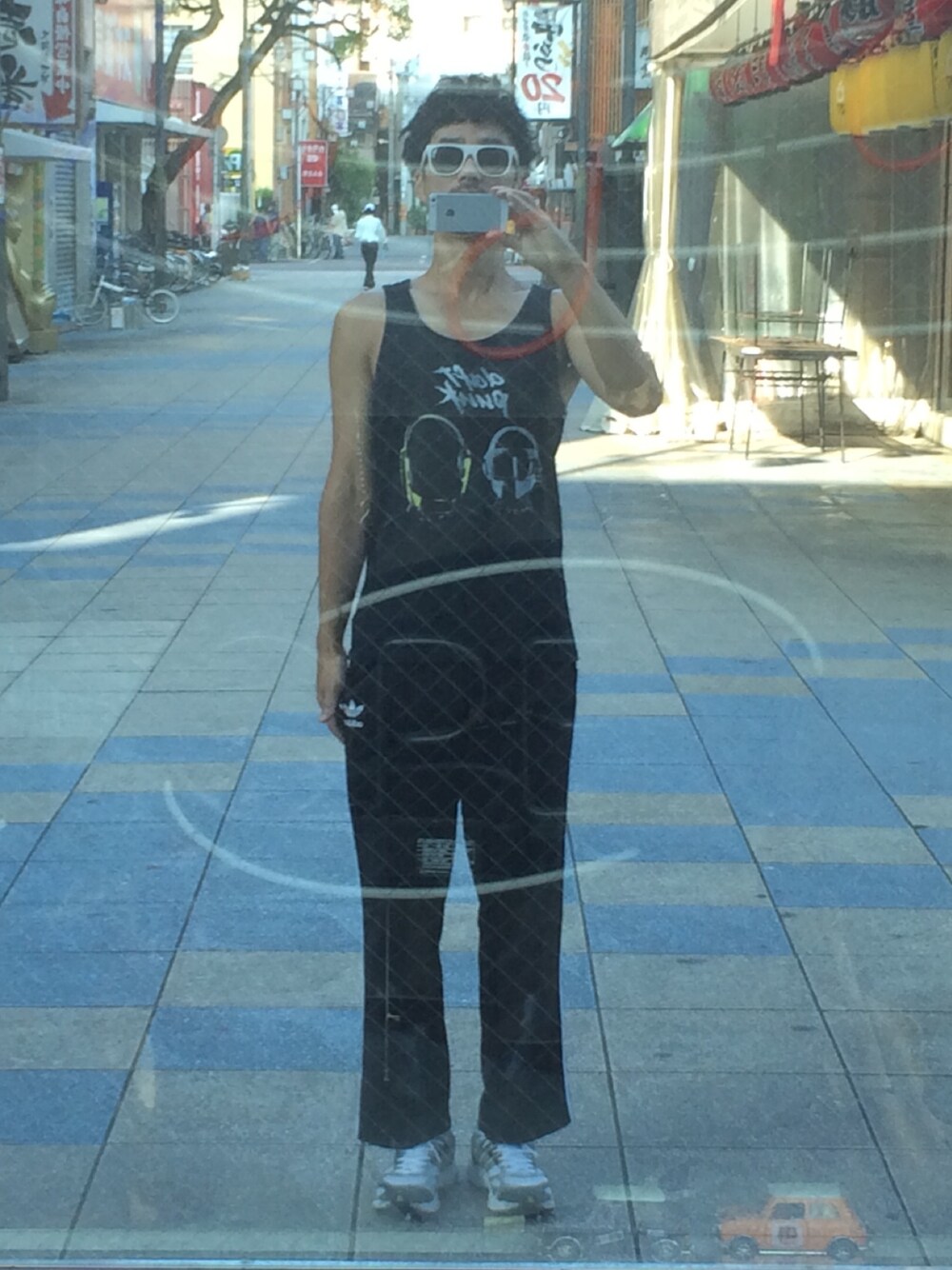 サングラス ノーブランド タンクトップ ダフトパンク ジャージパンツ アディダス スニーカー アディダス 朝のお散歩