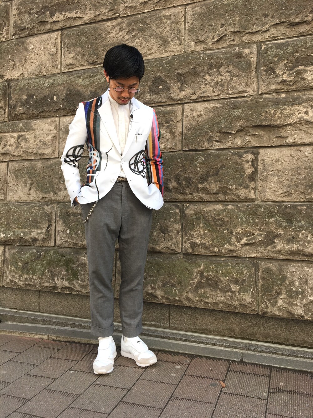 NIGOLDのJKTを主役にコーディネート。 インナーにはホワイトのバンドカラーシャツ。パンツにはテーパードの効いたdistrict UNITED ARROWSのスラックスを合わせました。