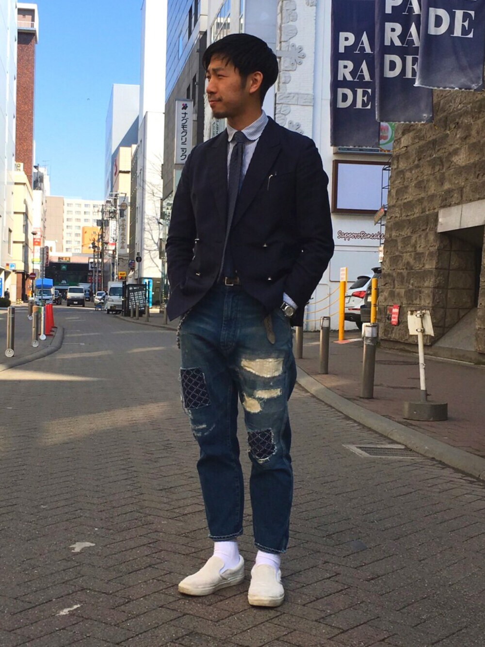 全体をブルートーンでコーディネート。 今回はUNITED ARROWS&SONSの刺し子デニムを主役にダブルのブレザーにニットタイで合わせました。