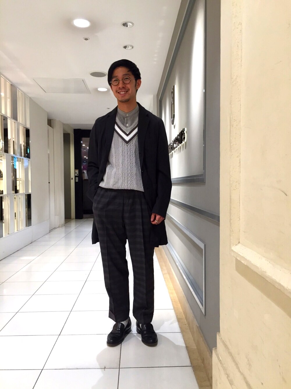 全体をグレーワントーンでグラデーションのコーディネート。 ジャケットの着丈を長くしたようなデザインのショップコートはワイドパンツにオススメです。 アウター:district UNITED ARROWS ニット:ドリミング オブ ザ シャイニングスター シャツ:ji×district UNITED ARROWS パンツ:district UNITED ARROWS