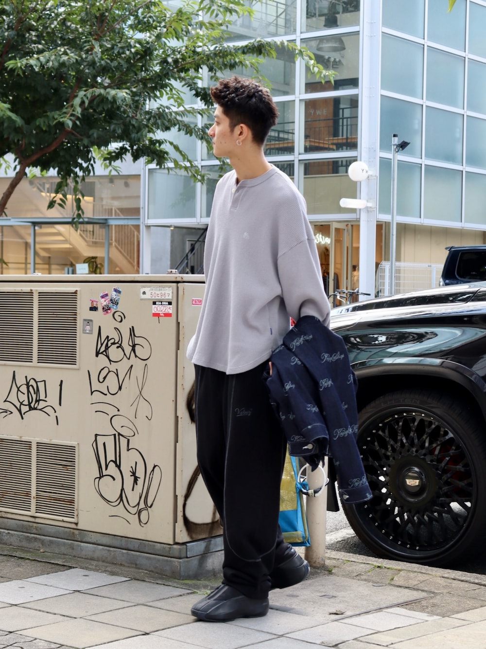 〝BALL STITCH SWEAT PANTS〟 をメインにコーデを組みました! デニムジャケットにスウェットパンツを合わせることでコーデにメリハリをつけました! 野球ボールのシームを表現したデザインになっており、ゆったりとしたサイズ感になっています! 裾にドローコードもついており、お気に入りのシルエットに調整可能です! 同シリーズのスウェット、フーディーとセットアップで着用可能です!