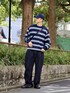 〝BORDER KNIT SWEATER〟をメインに同系色のキャップ,パンツと合わせカジュアルなコーデを意識しました! 程よい厚さでアクセントとしてインナーでも着用可能です!