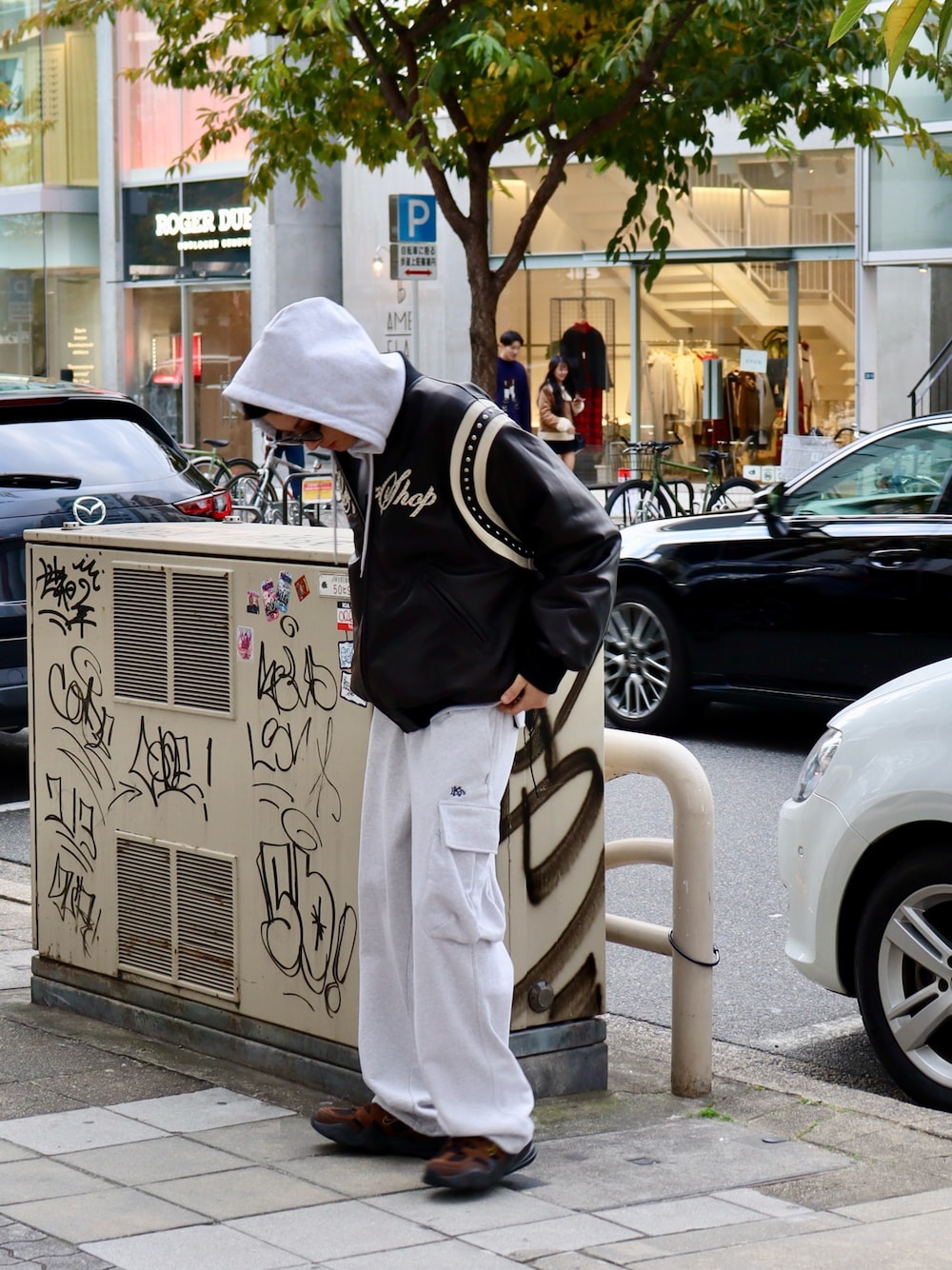 〝MHR LOGO SWEAT HOODIE〟をメインにセットアップで合わせ、 アクセントにスタッツレザージャケットも着用! ロゴが3D刺繍でデザインされておりロゴがアクセントなアイテムとなっています!