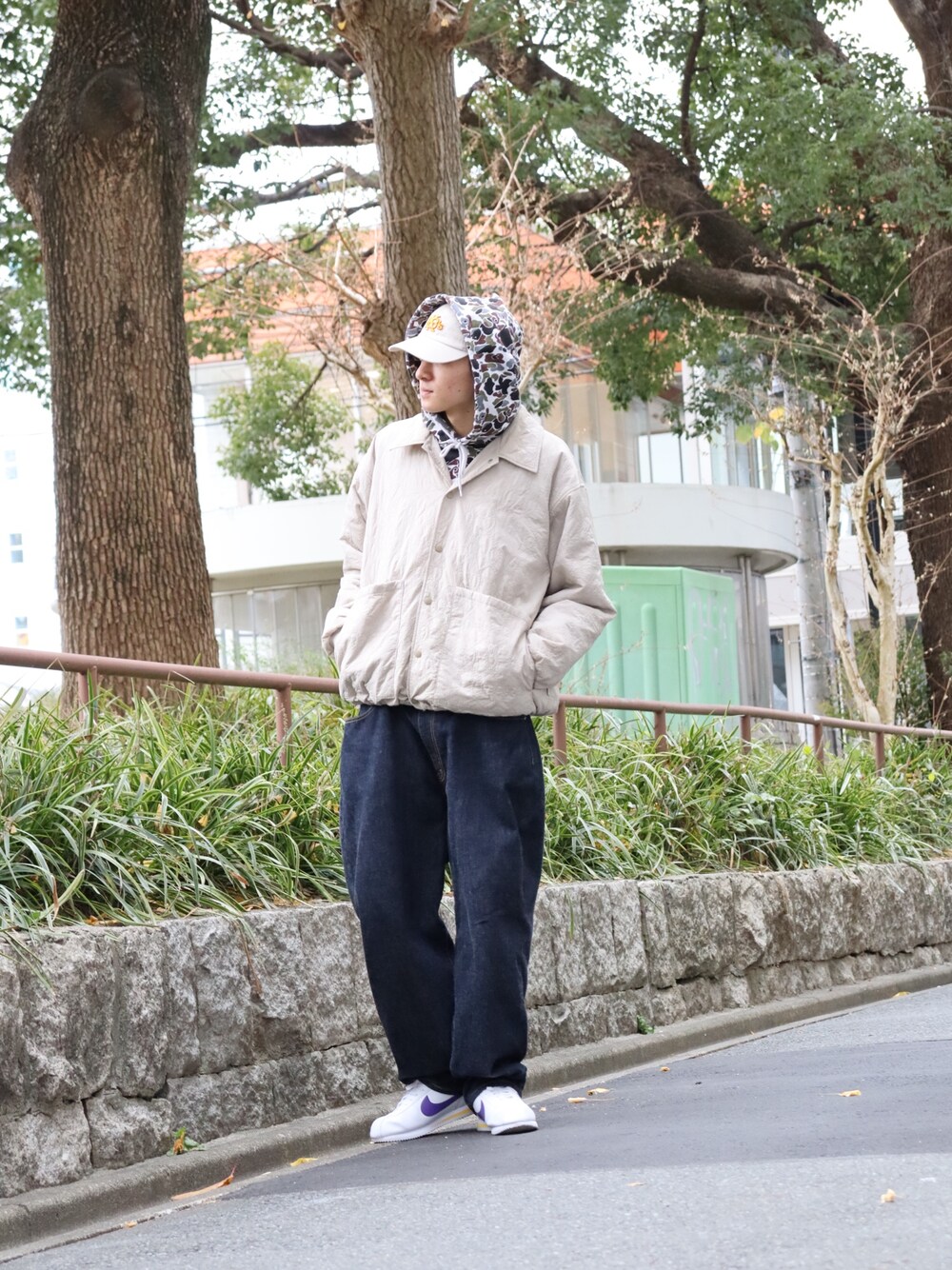 〝CAMO BB LOGO SWEAT HOODIE〟をメインにインナーとしてコーデを組みました! カジュアルなコーデでもフード部分のCAMO柄がとても映えるアイテムです! 同シリーズのパンツともセットアップで着用可能となっています!