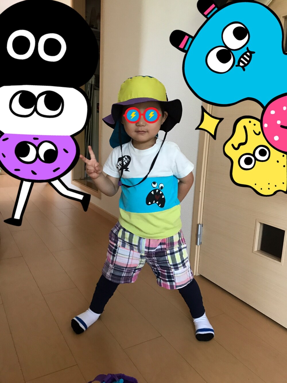 久しぶりの投稿です 公園に行くので、コケても膝を少しでもカバー出来ればいいとレギンスはかせました。 色がケンカしていて目がチカチカするけど、見つけやすいからOK!
