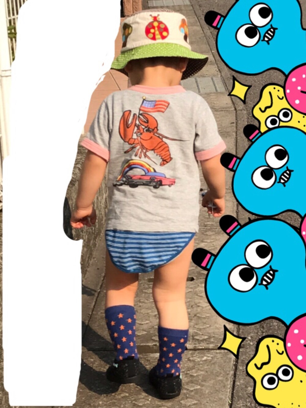 汚れたズボンを脱ぎ捨てて彼は家路に着くのであった… Tシャツはバックプリントの刺繍が可愛くて母ちゃんのお気に入り。 アメリカンなTシャツに合わせて靴下を星柄に合わせて見ました。