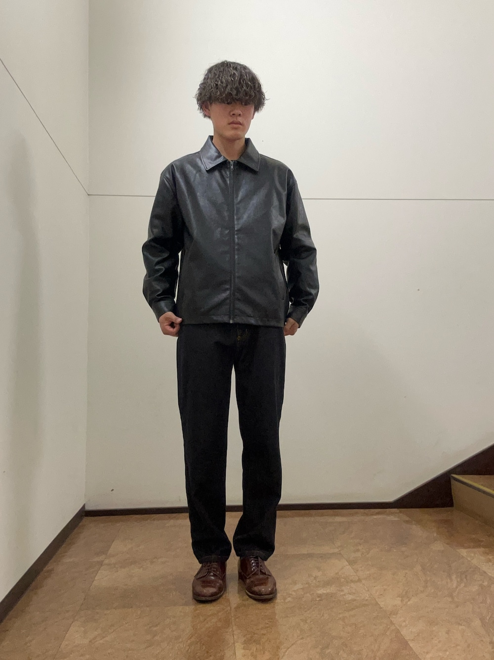 全体をダークトーンで統一して、素材感の違いで奥行きを出したのがポイント。 重くなりすぎないよう、足元は使い込んだブラウンの革靴で抜け感とヴィンテージ感をプラスしました。