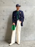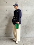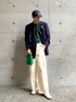 白のカーゴパンツと紺ブレを合わせたスタイル🚶 ジャケットでキレイめなアイテムを使い、capとカーゴパンツのようなカジュアルアイテムも使ってドレスとカジュアルのバランスを意識しました☺︎ また差し色としてグリーンのインナーとハンドバッグを持ってきています🙋♂️