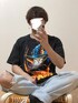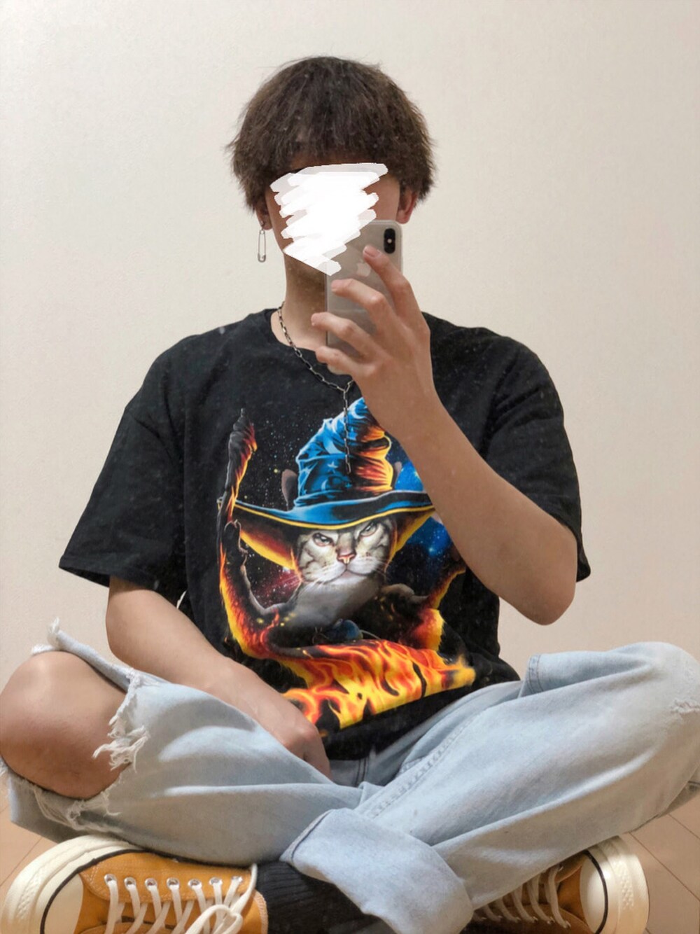 魔法使いの猫Tシャツが存在感あって可愛いので、色薄めのデニムで合わせました