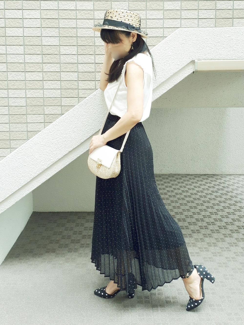 おはようございます☺️ 今回はモノトーンコーデ🎵 夏のsaleで購入したホワイトのビックカラーのカットソーに同じくsaleで購入したブラックのドットプリーツスカートを合わせたプチプラコーデです💕 カットソーもスカートも70%オフの600円位で購入しました✨ 上下で1200円でコーデ完成してるようには見えませんよね😁✨ 小物もプチプラ🎵 ドットチュールのカンカン帽 ホワイトのストローバッグ ブラックのドット柄セパレートパンプス エッフェル塔のイヤリングです。 前回コーデをKyoさん、bochukunさん、myuuちゃんがフォルダに入れて下さいました🙆どうもありがとうございます💕 いつも見て下さりどうもありがとうございます☺️