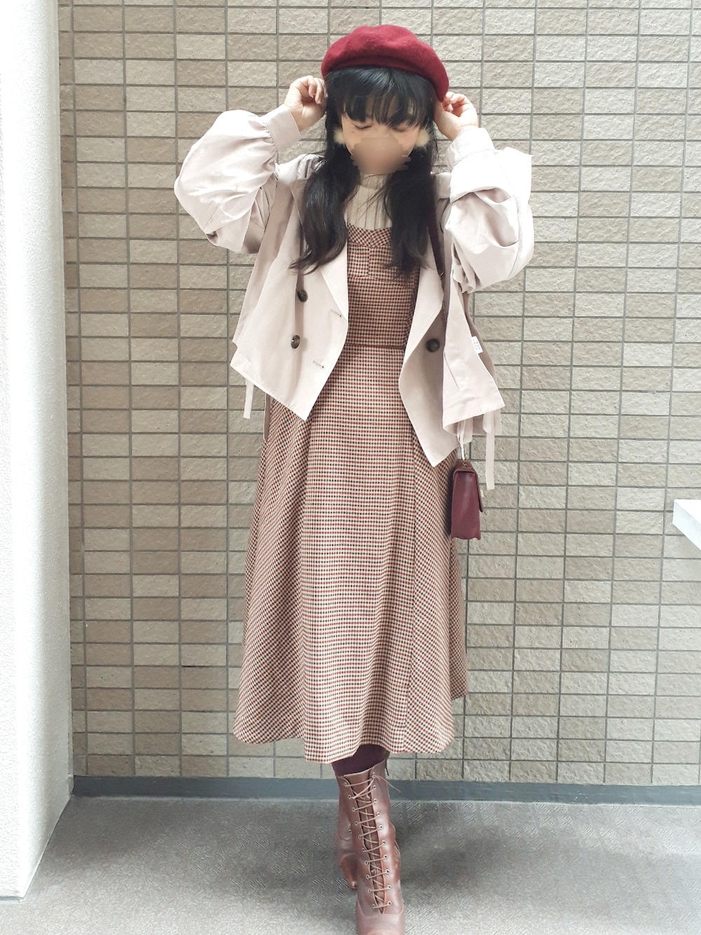 おはようございます☺️ 今回のコーデはベージュ×ブラウン×ボルドーコーデ🎵 アイボリーのタートルリブニットに後ろのチュールがとっても可愛いブラウンチェックのジャンパースカートを合わせて、淡いベージュのショート丈のトレンチコートを羽織りました💕 ジャンパースカートの後ろはボルドーのチュールスカートが覗くデザインで後ろ姿がとっても可愛いのでスワイプしてみて下さいね✨ 小物は ボルドーのベレー帽 ボルドーのバッグ 赤みがかったブラウンのレースアップブーツ ホワイトのファーイヤリングです。 前回コーデをarinaさん、bochukunさん、myuuちゃんがフォルダに入れて下さいました🙆どうもありがとうございます💕 いつも見て下さりどうもありがとうございます☺️