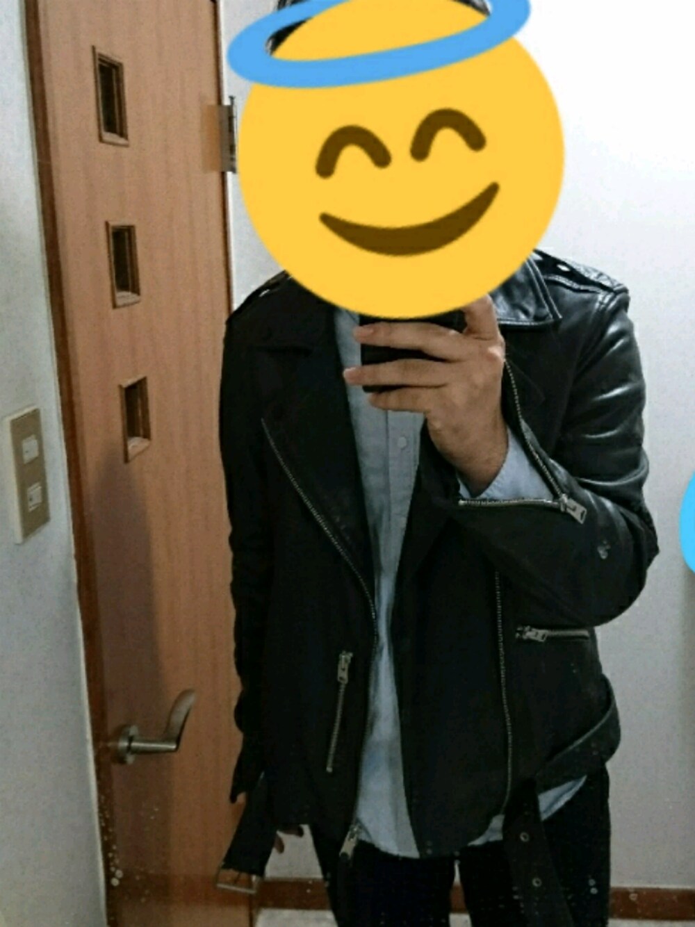 ダブルライダースとデニムの色が どちらともブラックなので、中にブルー のシャツを着てみました。シャツを着ることにより中和されて良い感じです。