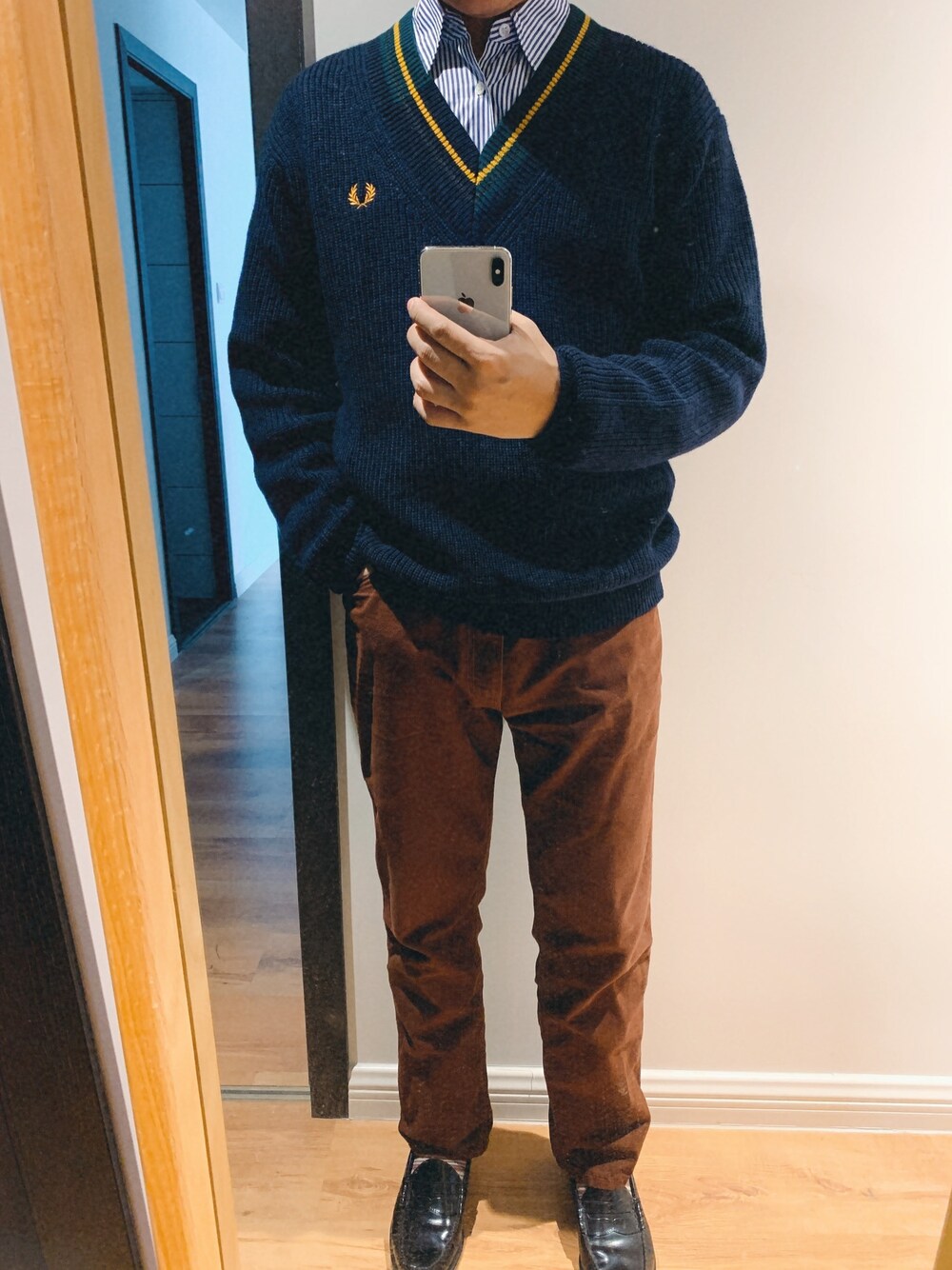 FRED PERRY今年新作のクリケットセーターを早速入手!個人的はこういうレトロ感のアイテムが大好き。ギャルソンのストライプシャツとコーデしてアイビースタイルを演出してみました。