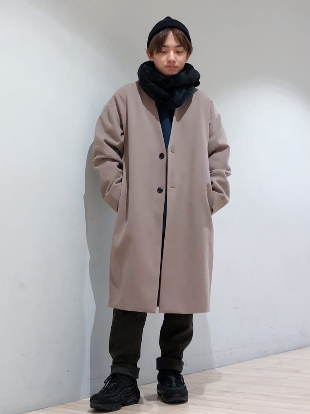ノーカラーコートでスッキリとしたコーディネート。