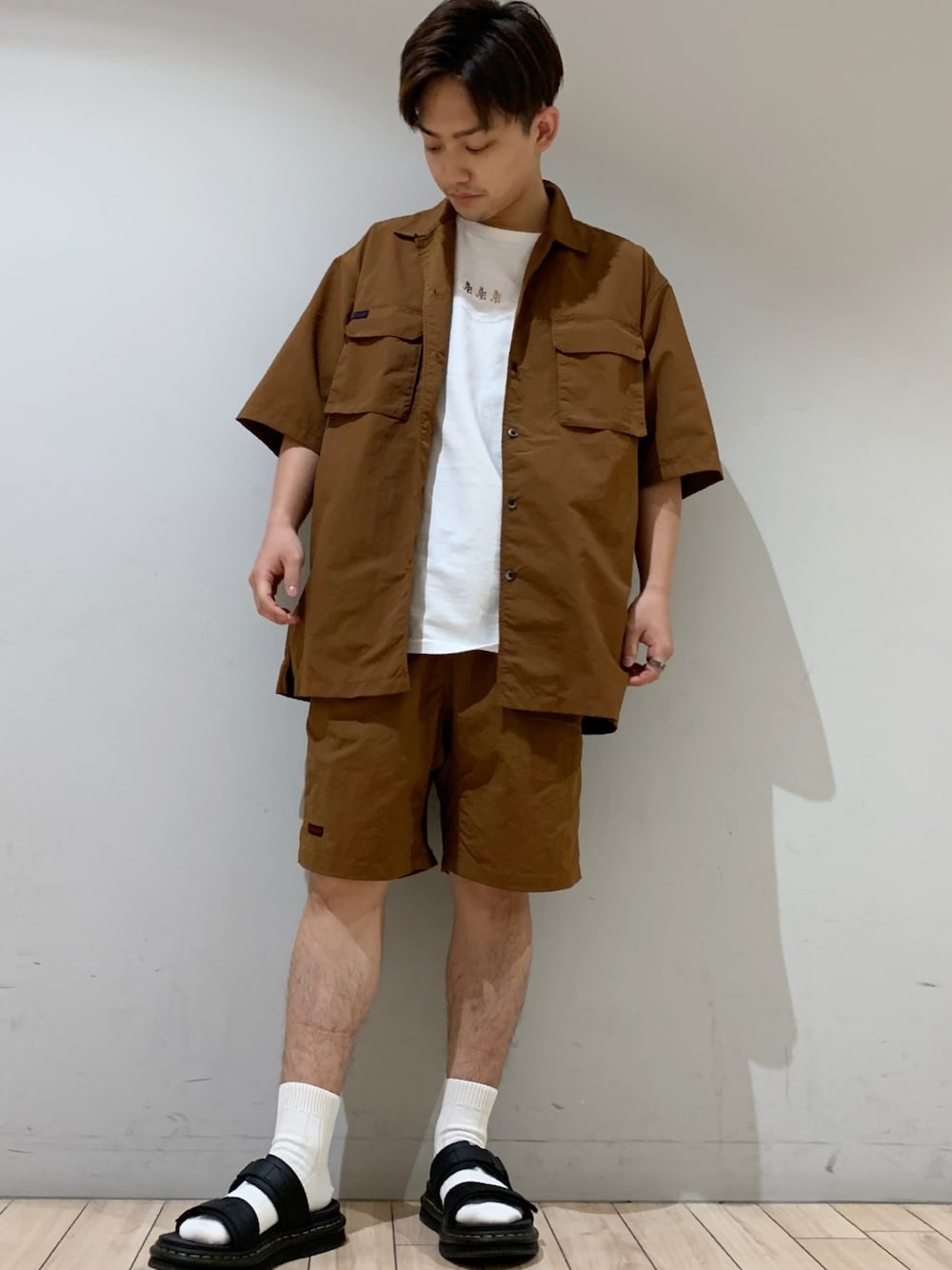 ミチの別注のシャツはナイロン100%なので夏にぴったりの素材。夏でも涼しく着れます。 セットアップでショーツと合わせると雰囲気のある大人セットアップコーデの完成! 普通のセットアップに飽きた方はオススメ!