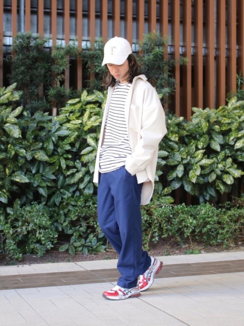ボーダーを使った春コーデ! 2色使いを意識してネイビーパンツとボーダー柄をかけてアメカジマリンスタイル。 気温が上がってきたので春らしい柄を取り入れていきましょう。