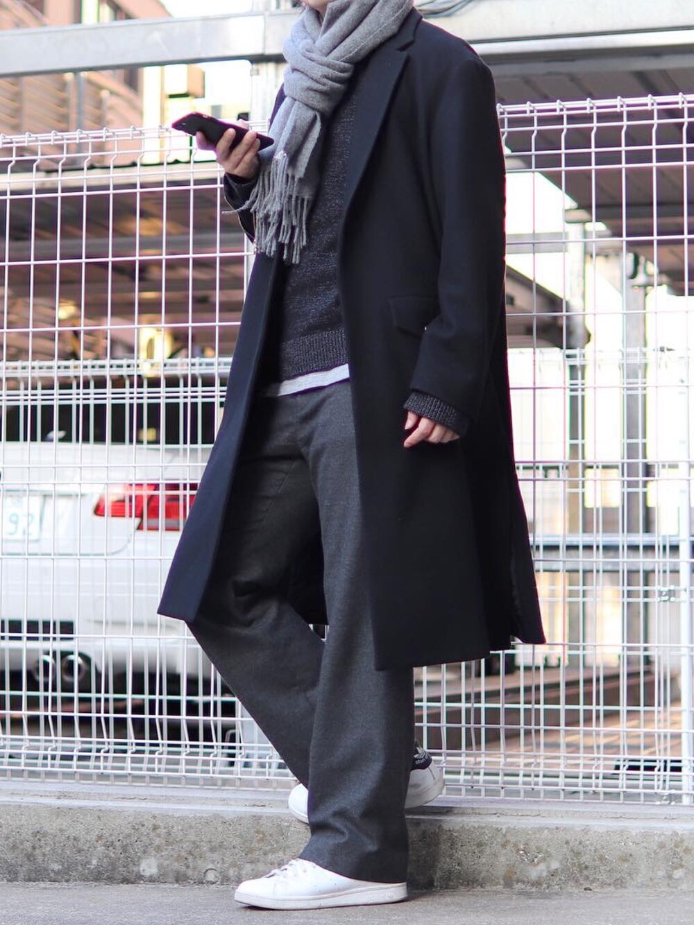 黒とグレーのワントーン。 少し重くなるので足元は白のスタンスミスで