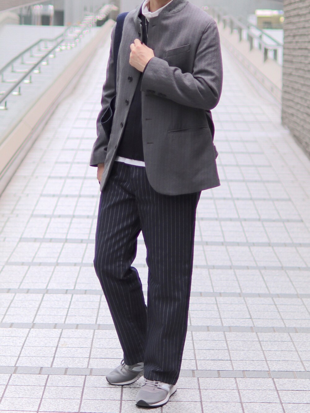ネイビーとグレーを掛け合わせたコーデ。 ⠀ タートルネックのカットソーの上に、 ノーカラーのジップブルゾンを挟んで、スタンドカラージャケット。 首元で立体的なレイヤードを組むイメージでコーデしました