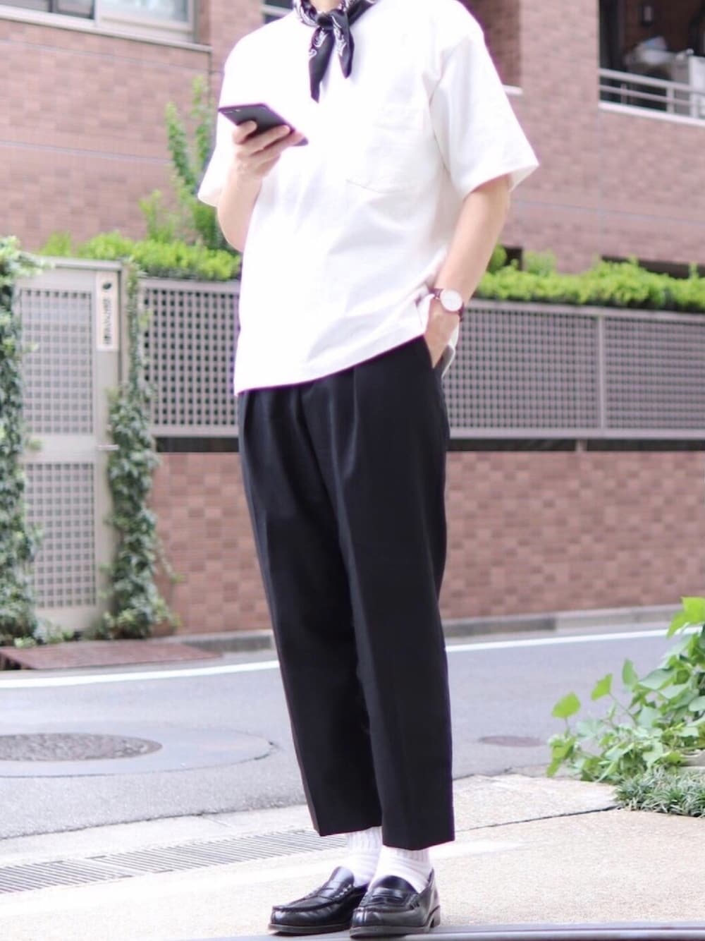 かなりシンプルなコーデ。 シルエットはゆるめにまとめて スカーフをアクセントに。
