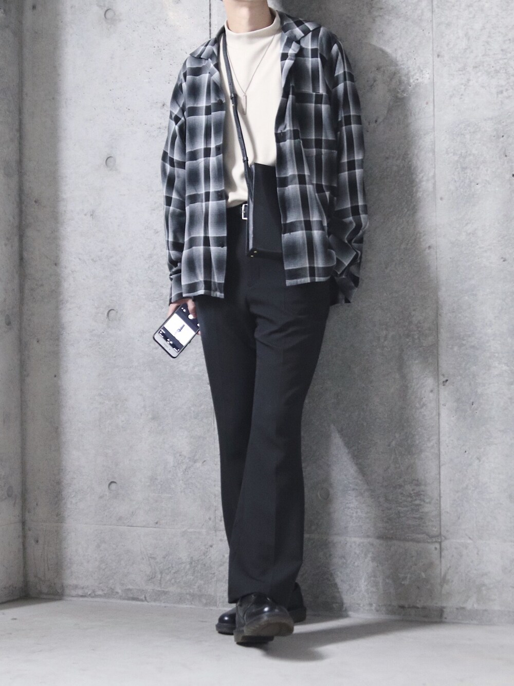 チェックシャツを主役に。 カジュアルなチェックなので、黒の小物やフレアスラックスでドレス感のバランスを取りました。
