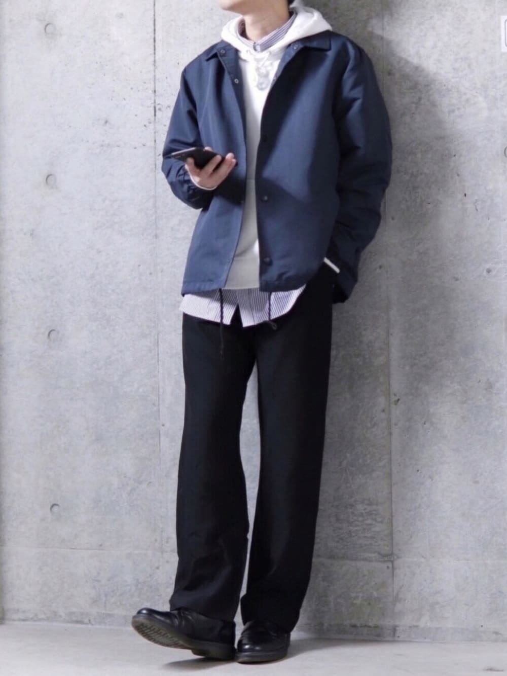 ちょっと前のコーデ、 パーカーを着てるバージョン。 このコーチジャケットは、 こんな風にスウェットのパーカーなどと合わせても楽しめます。 落ち着いたネイビーなので、 綺麗めにまとめられます。 ここにキャップやスニーカー合わせて ストリート寄りに振るのも良さそう👟 #PR